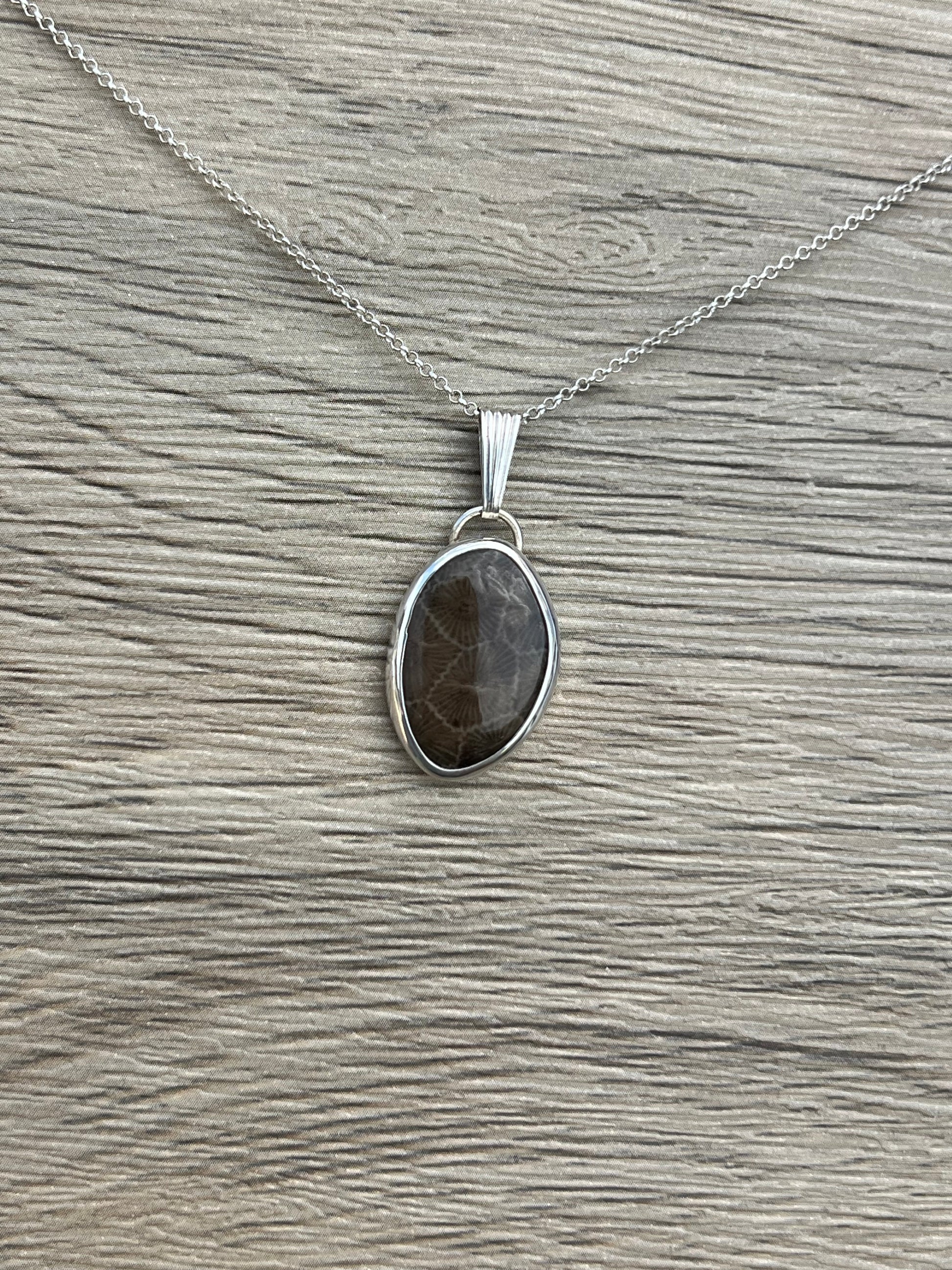 - Design: Classic pendant setting to highlight the unique fossil pattern