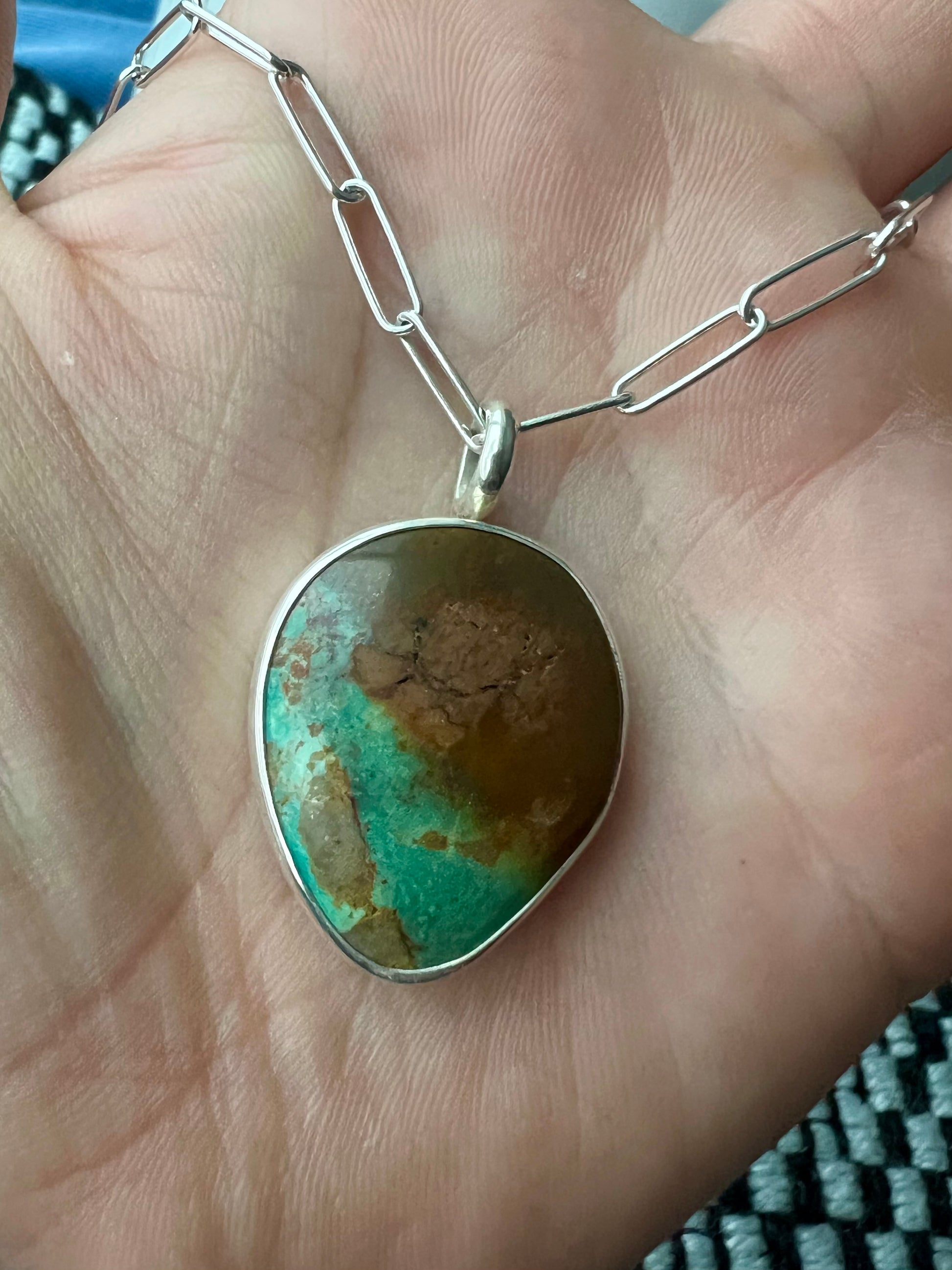 Chunk gorgeous turquoise on an 18” Paperclip chain. This bail is large enough it can be switched out with any standard chain.